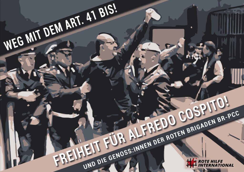 41bis ist das härteste Isolationshaftregime in Europa. Ursprünglich eingeführt, um Mafiamitglieder daran zu hindern, ihre Aktivitäten vom Gefängnis aus fortzusetzen, wurde es bald auf revolutionäre Gefangene ausgeweitet, um ihnen jegliche Interaktion mit der Außenwelt zu untersagen. So sind drei Gefangene der Roten Brigaden-PCC, Nadia Lioce, Roberto Morandi und Marco Mezzasalma, seit 17 Jahren diesem System unterworfen. Der Wert ihres Widerstandes muss daran gemessen werden, dass sie sich nur politisch ergeben müssten, um aus diesem Regime herauszukommen.