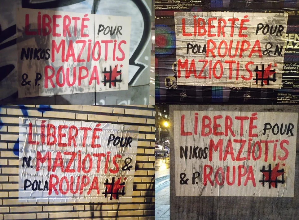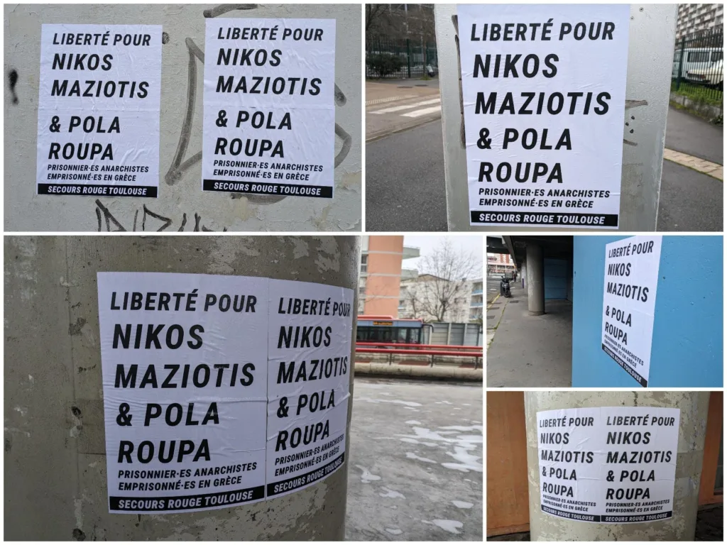 Pola Roupa et Nikos Maziotis ont été condamnés à plusieurs années de prison pour leur participation et leur action dans l’organisation de guérilla Lutte Révolutionnaire. Ils ont été emprisonnés et ont purgé la peine cumulée de 20 ans de prison à laquelle ils ont finalement été condamnés (après le procès qui a cassé leur peine à perpétuité pour l’attentat à la bombe contre la Banque de Grèce – succursale de la Banque centrale européenne – bureau du Fond monétaire international en Grèce). La camarade Pola Roupa a purgé 8,5 ans de prison réelle (13,5 ans mixtes), tandis que Nikos Maziotis a déjà purgé 11 ans de prison « ferme » et un total de 14 ans mixtes. C’est-à-dire les 3/5 de leur peine, comme le dictent les lois de l’État. Pola Roupa a été libérée de prison sous conditions restrictives le 17 novembre 2023 et quelques jours plus tard, le 28 novembre 2023, le procureur adjoint d’Eubée a fait appel de sa libération, demandant qu’elle soit ramenée en prison. Cet événement sans précédent a conduit Pola devant un nouveau conseil judiciaire au tribunal de Chalkida le 10 janvier, afin de juger si elle restera libre. Nikos continue à subir un traitement spécial, exceptionnellement répressif. Il a reçu quatre refus de libération conditionnelle en deux ans parce qu’il reste impénitent (la justification du dernier refus évoque : « un mépris total de la justice et du système pénitentiaire. »). En attendant la décision de la cour d’appel d’Eubée, un appel avait été lancé pour une journée de solidarité le 9 février. Plusieurs initiatives ont été menées par différentes sections du SRI. Sur les photos ci-dessous: collages à Bruxelles et à Toulouse, banderole à Genève.